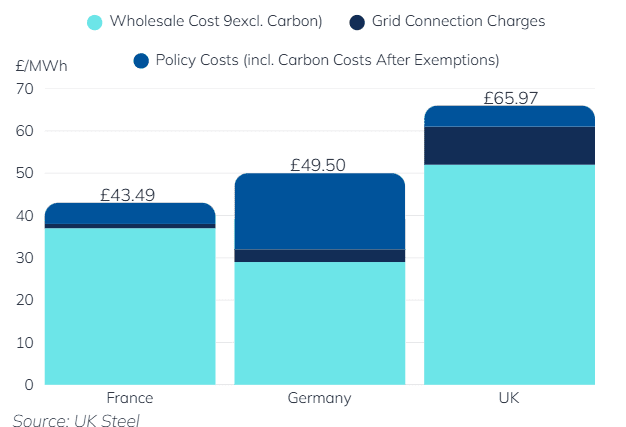 The average electric price faced by UK steelmakers for 2024/25 is £59.48 per MWh compared to the French price of £47.76/MWh and £52.04/MWh in Germany. That’s a price gap of up to £7-12/MWh, meaning we pay £26 million or 14-25% more for our electricity this year than our European competitors. The price disparity is predominantly driven by higher UK wholesale costs and partly through greater network charges.