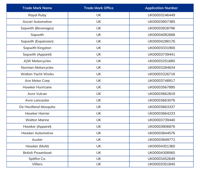 The portfolio comprises a curated collection of historically established British engineering brands with documented use across aviation, automotive, motorcycle, marine, and adjacent lifestyle sectors. Many of the names originate from formative periods of British industrial development and retain strong recognition and narrative value in both domestic and international markets.