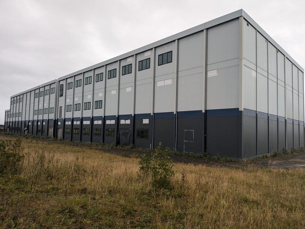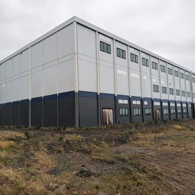 A large demountable building with an estimated total floor area of c.4500 m2, supplied and installed by Portakabin and comprising of two linked sections, each of three storeys, with internal staircases and being largely open plan.