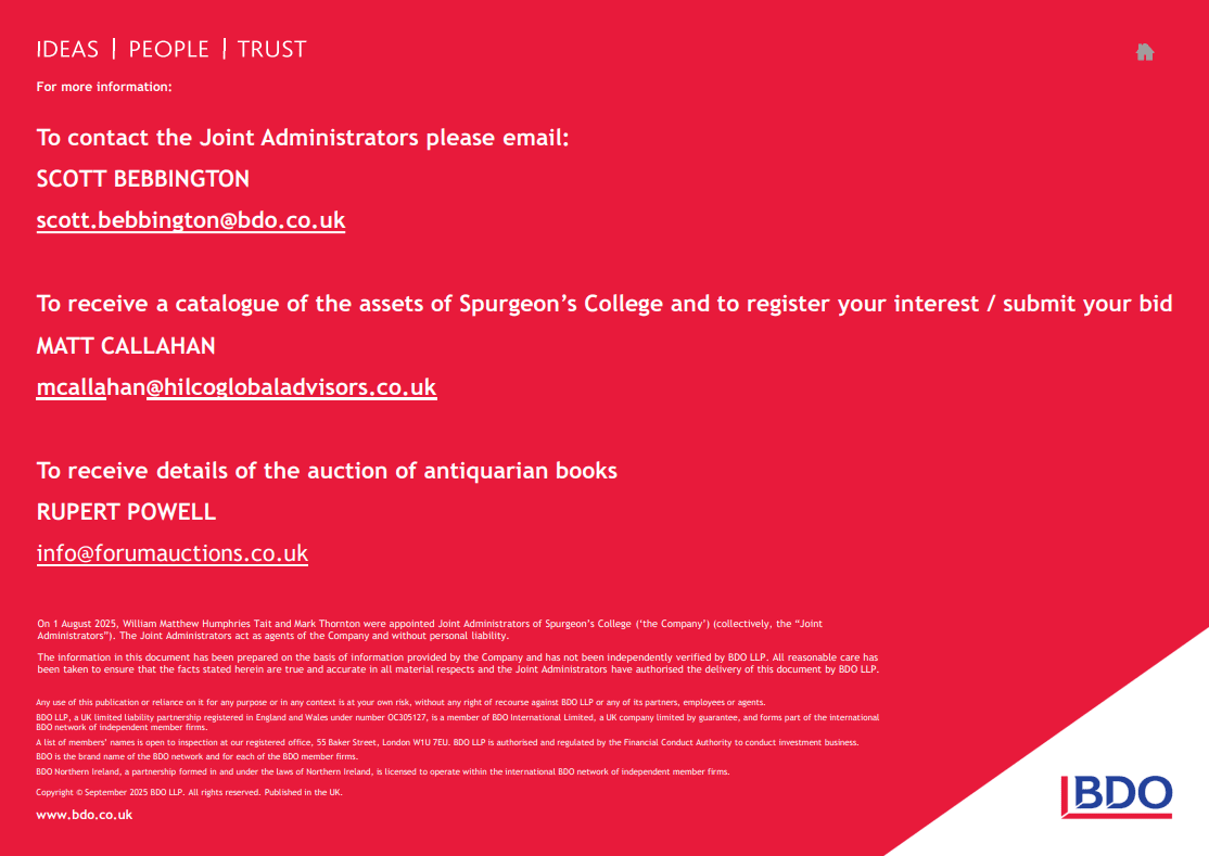 Acting on behalf of William Matthew Humphries Tait and Mark Thornton of BDO LLP, Joint Administrators of Spurgeon’s College, we are offering an exclusive opportunity to acquire a wide range of specialist theological and educational assets through a range of sales via an online tender sale.