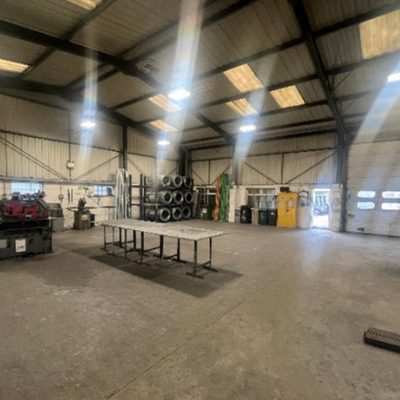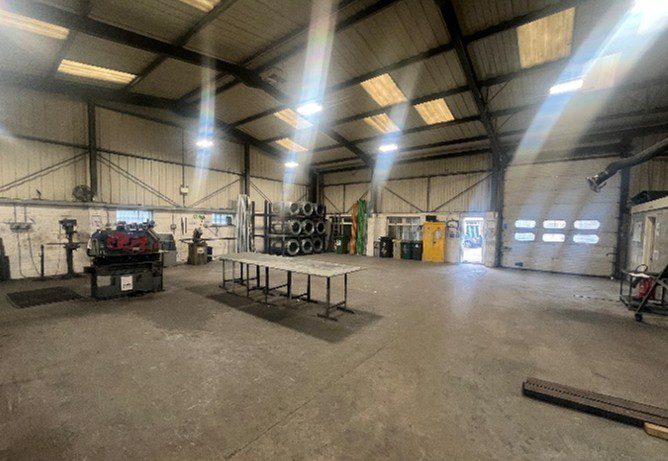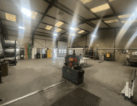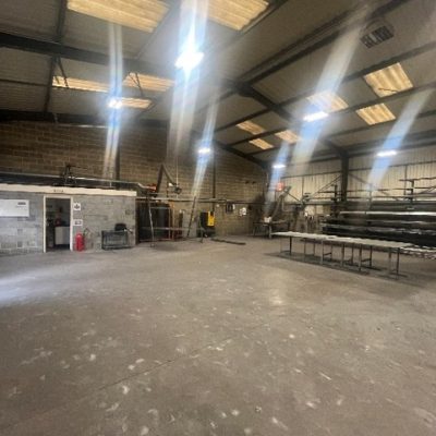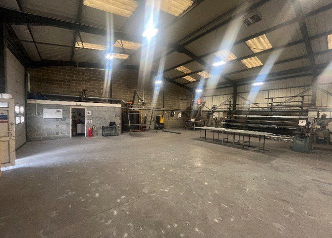A semi detached industrial/warehouse unit of steel portal framed construction, with part block/brick and part profile sheet elevations with a roller shutter door beneath a pitched profile sheet roof. The accommodation provides open plan warehouse accommodation with a concrete floor, a kitchenette and two WCs.